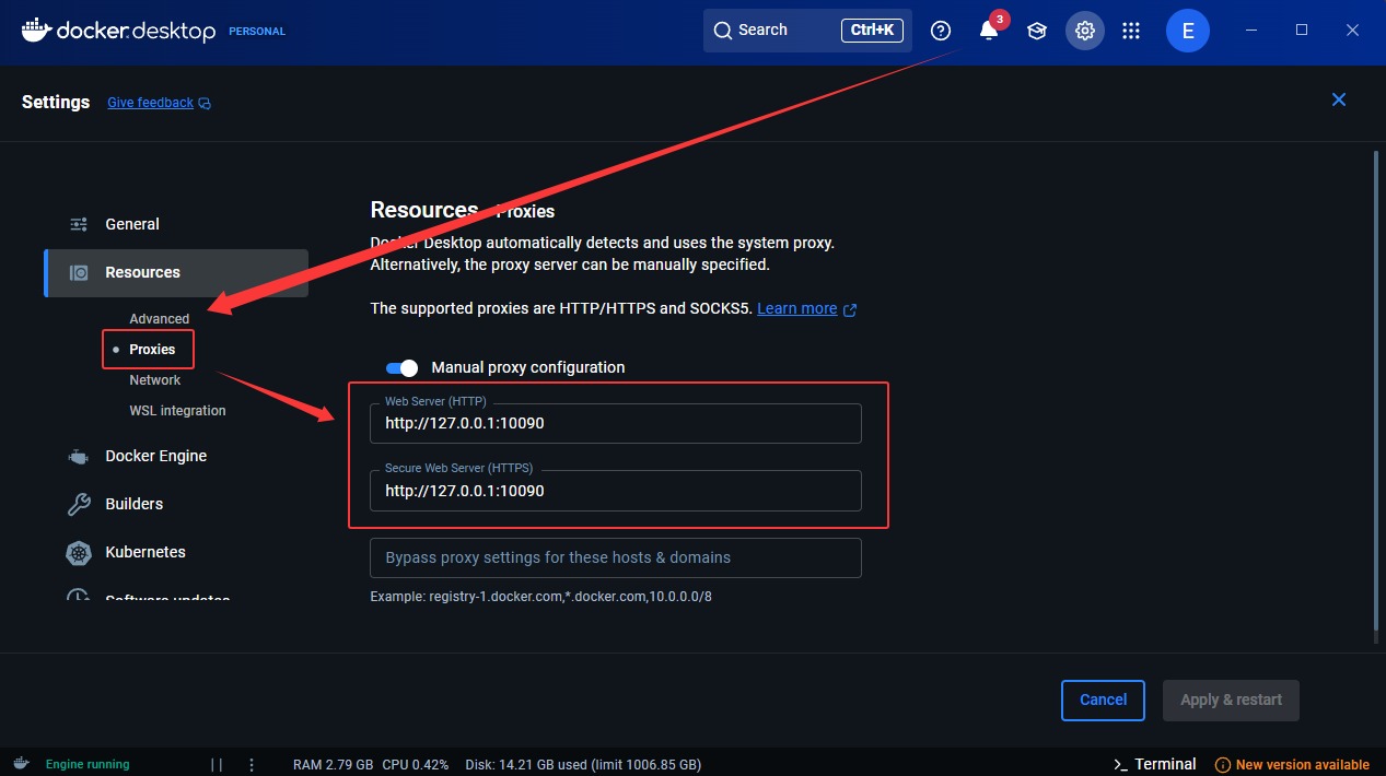 在 Docker 代理设置中更换为 WSL 的 IP 并重启 Docker :