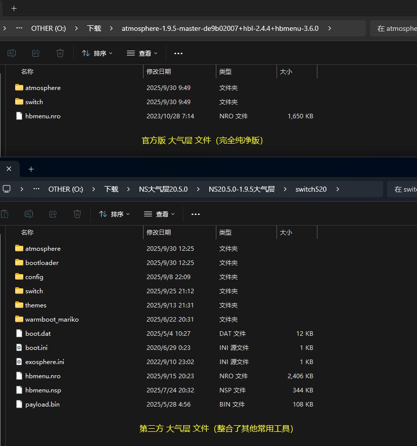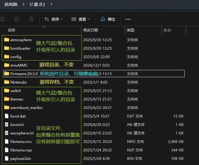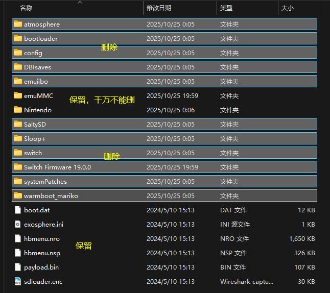 - 之所以删除的原因,是因为这些目录都是旧版大气层、旧版系统固件、旧版第三方工具、或它们运行时产生的配置/日志等,升级后不兼容,没必要保留