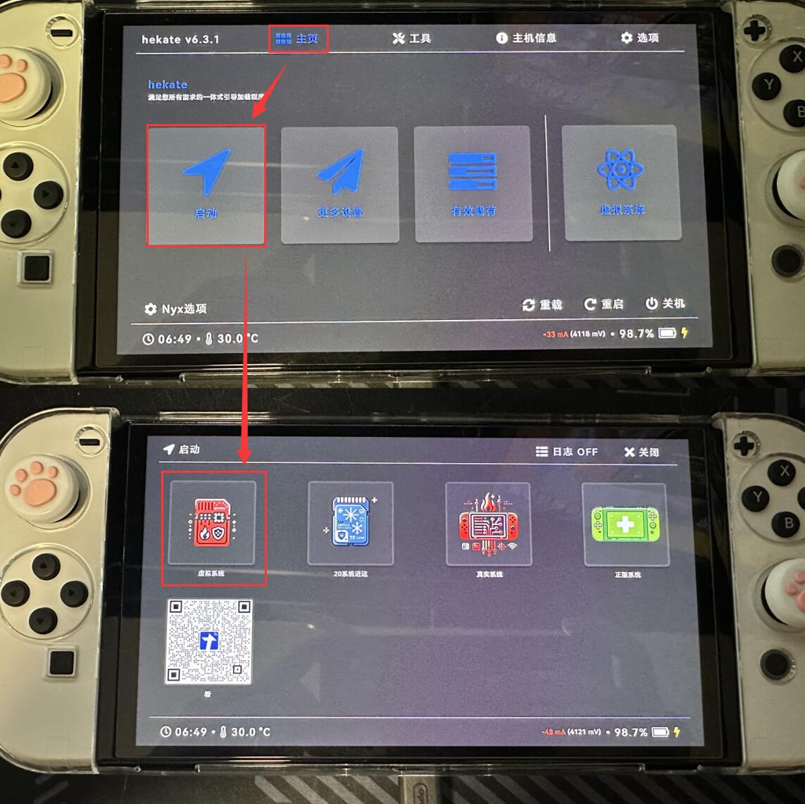 首先重启 Switch 进入 hekate 引导程序,依次点击【主页】【启动】【虚拟系统】: