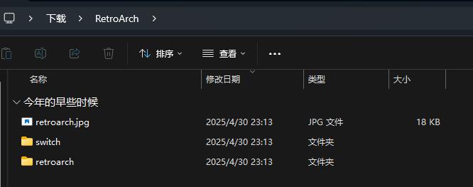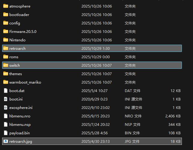 retroarch: RA 主体目录switch: 里面只有一个retroarch_switch.nro启动文件retroarch.jpg: Logo 图片