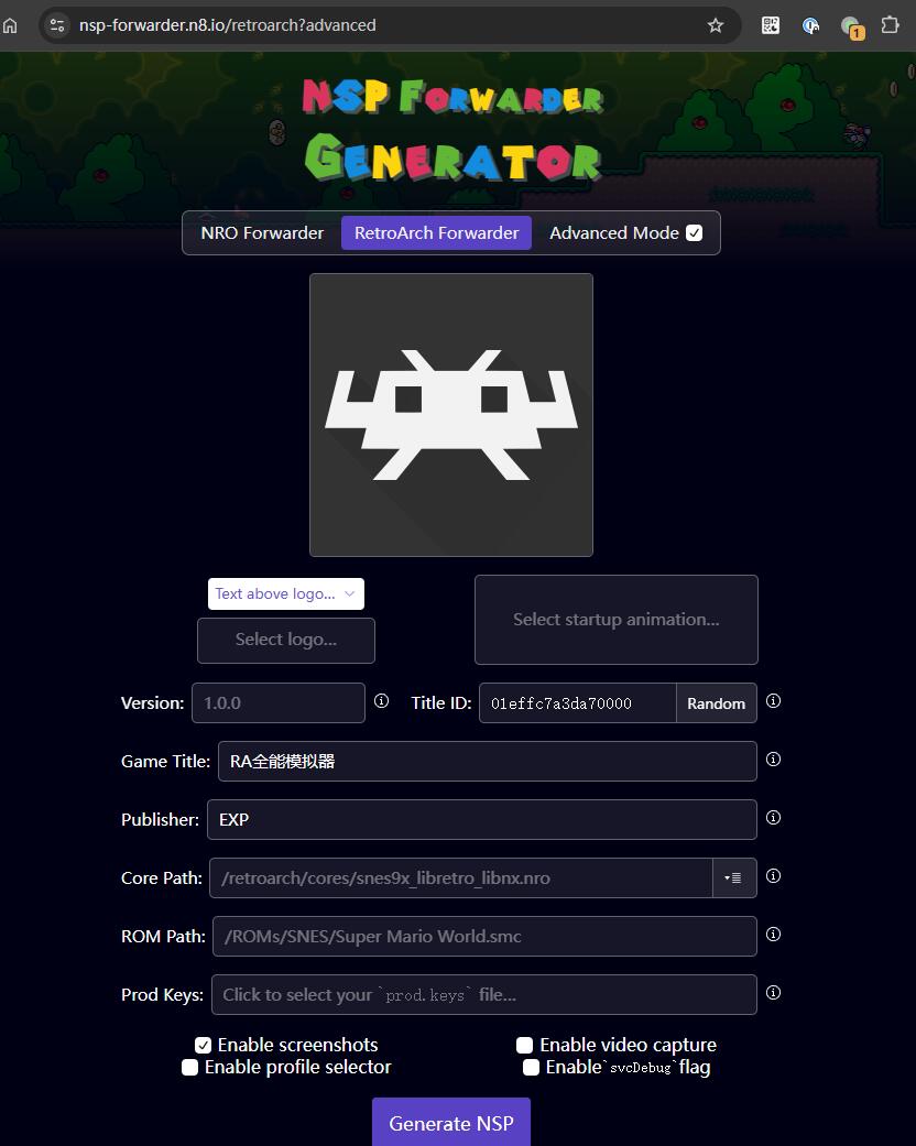 社区提供了一个 在线版的 Forwarder NSP 转换工具,不仅支持其他游戏的 .nro 通用转换,甚至针对 RA 的 .nro 专门提供了一个转换入口: