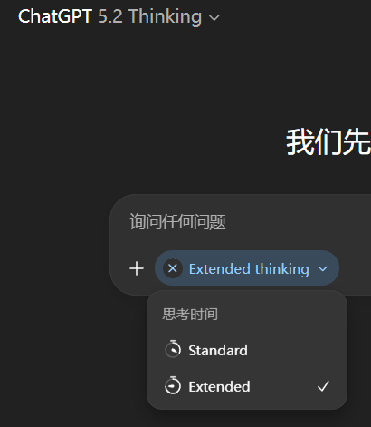 而 ChatGPT-5.2 默认是打开了联网搜索功能的,我们只需要确保它的深度思考模式(Extended)启用即可。