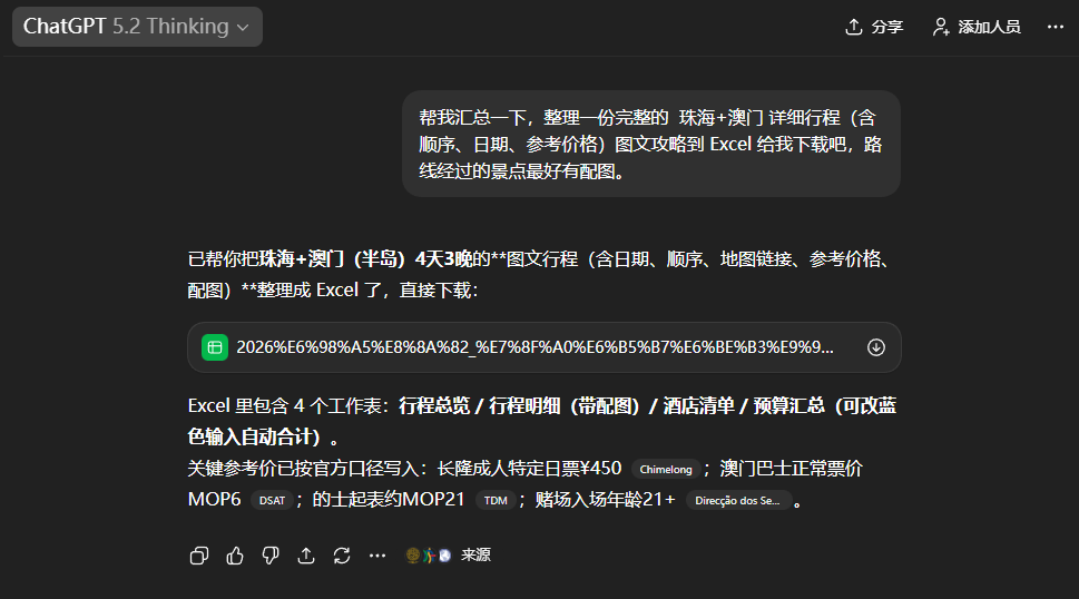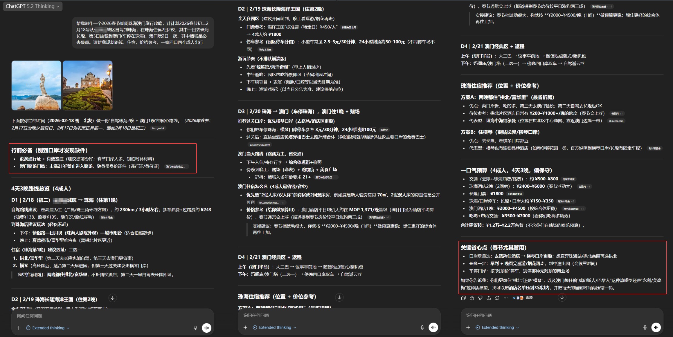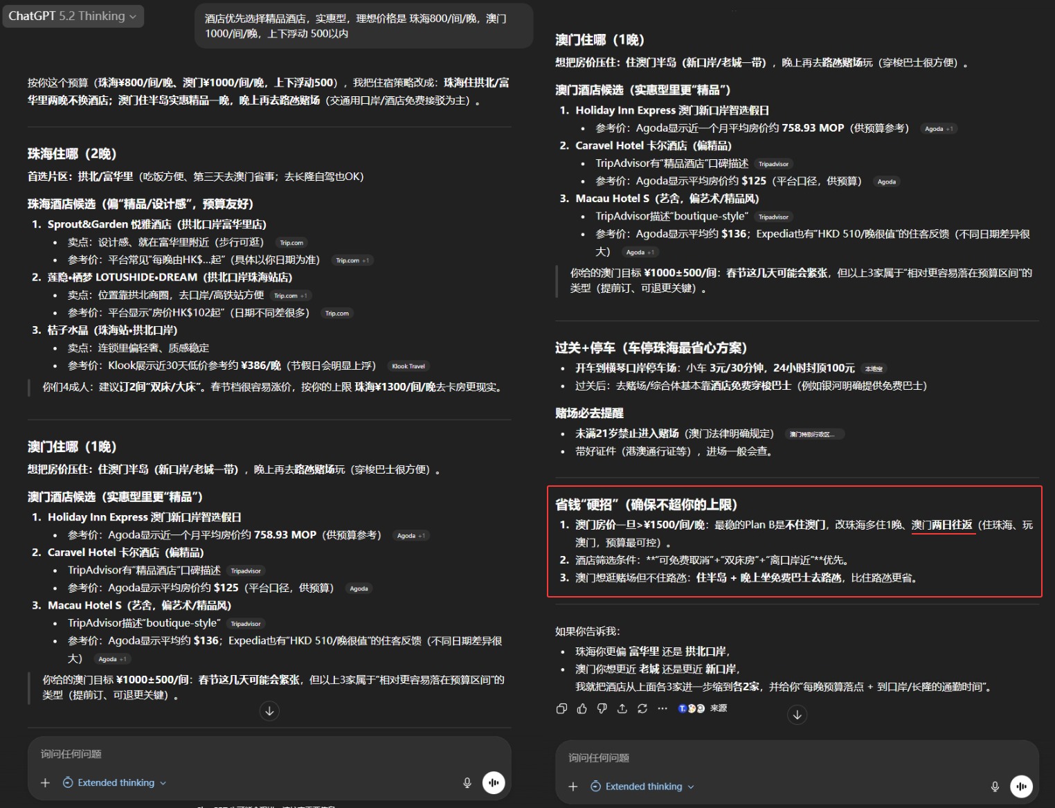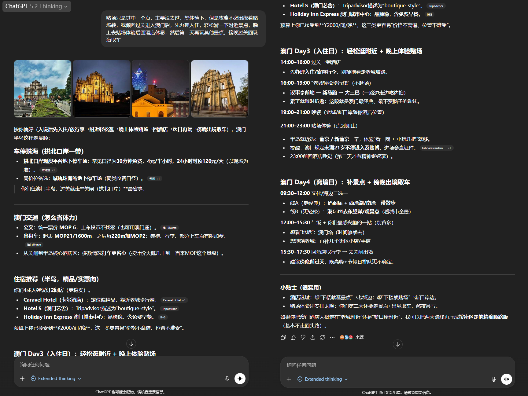 但是这里 ChatGPT 为了帮我省钱,出了点状况:因为澳门酒店费用贵、建议我全程住珠海 “澳门两日往返”。