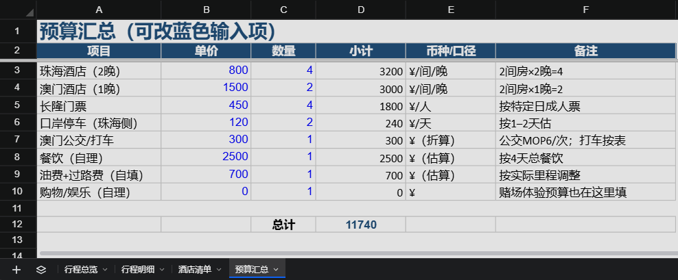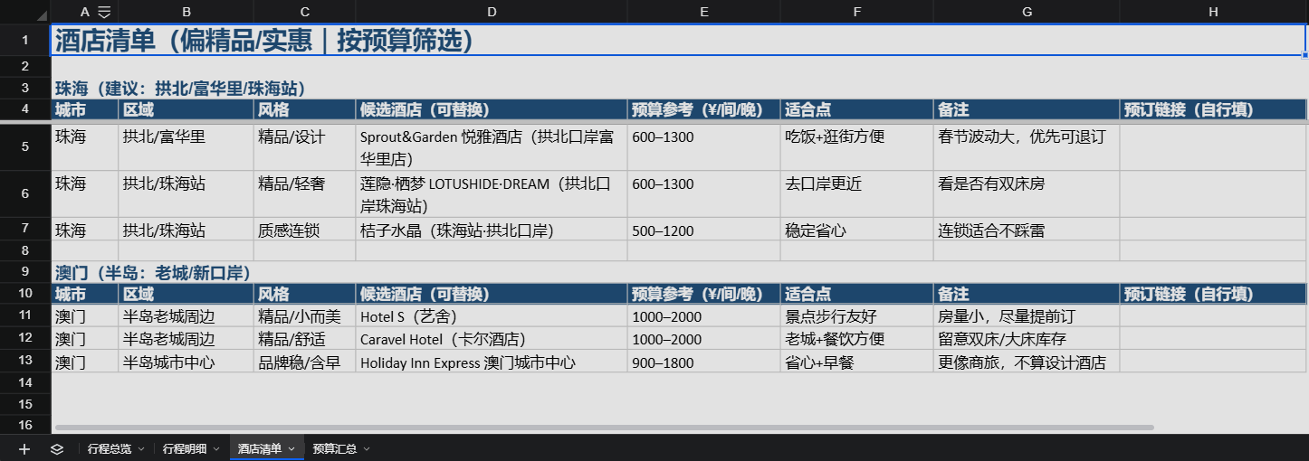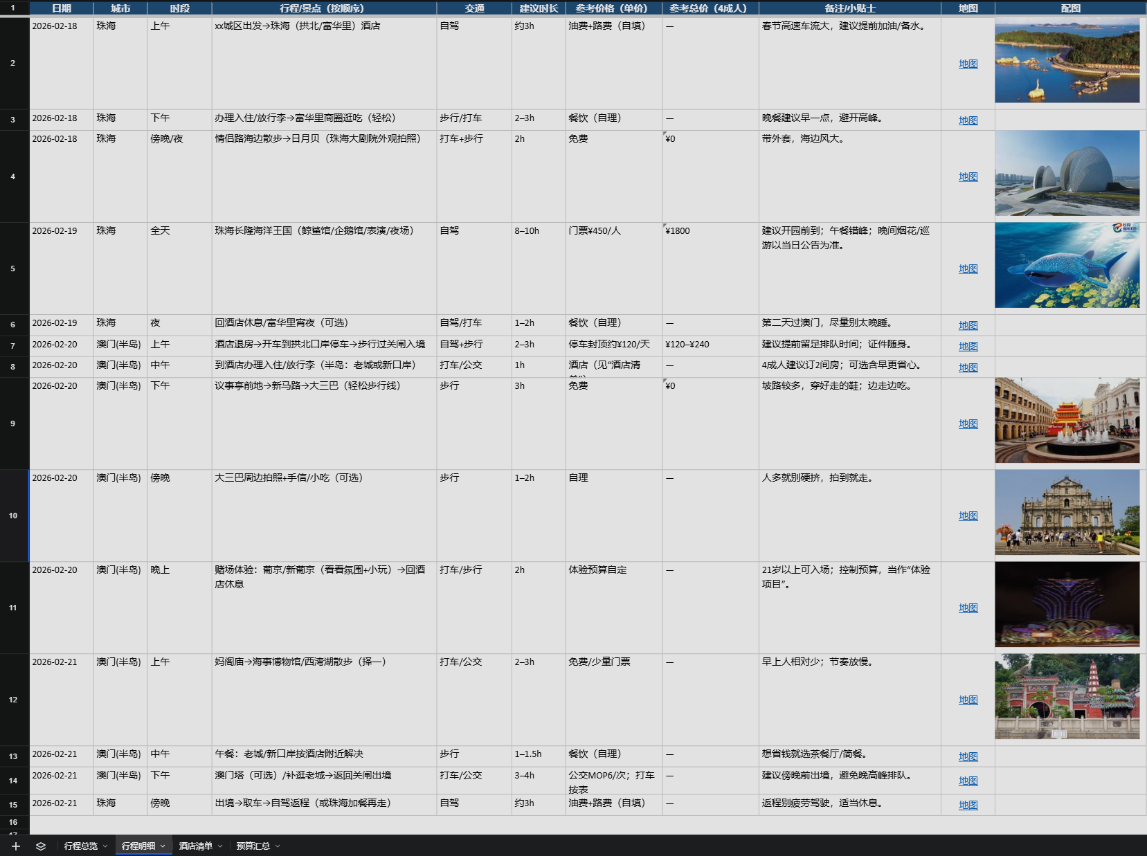 帮我汇总一下,整理一份完整的 珠海+澳门 详细行程(含顺序、日期、参考价格)图文攻略到 Excel 给我下载,