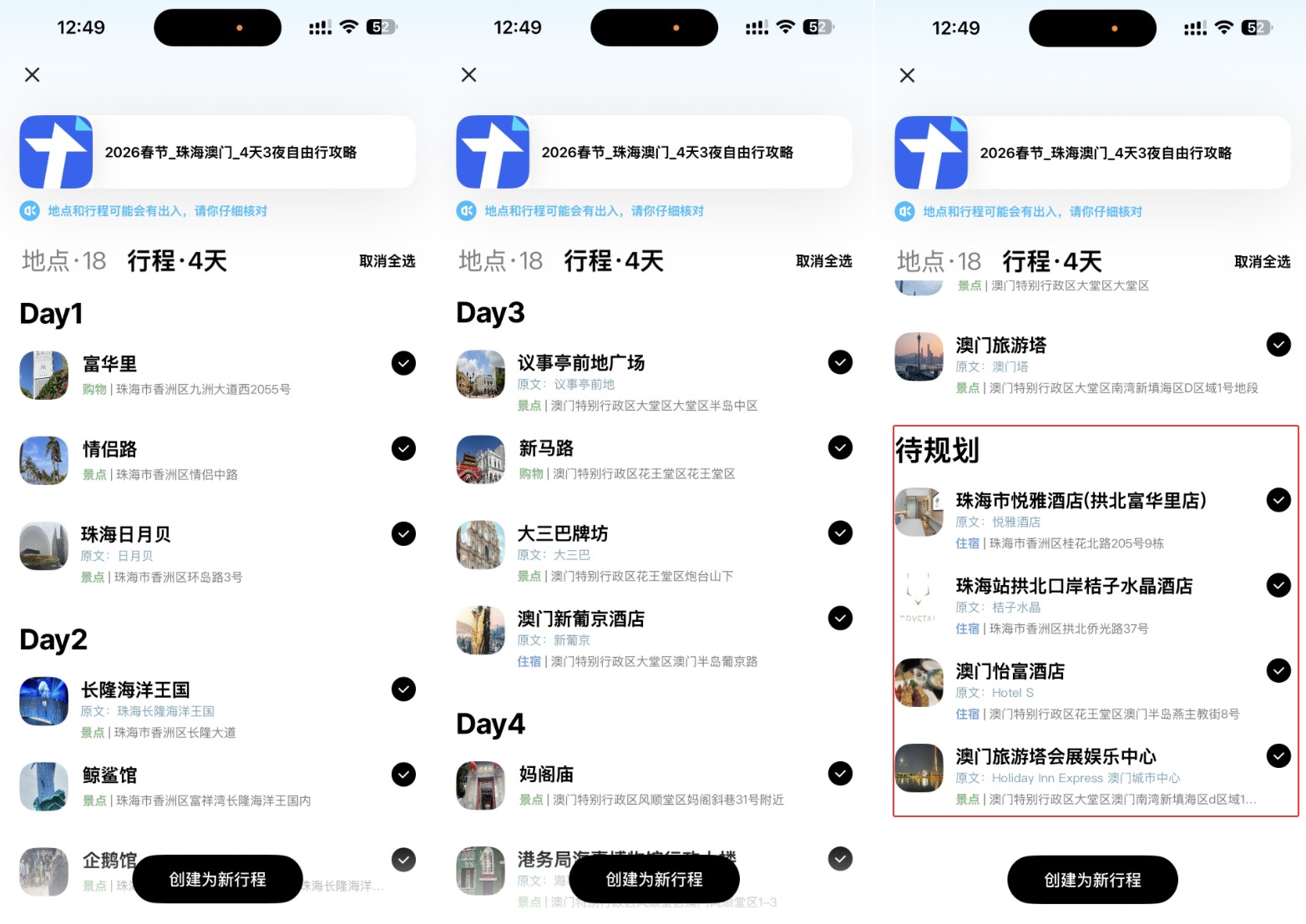 随后点击下方【创建为新行程】按钮,即可一键生成手机版的旅游攻略。